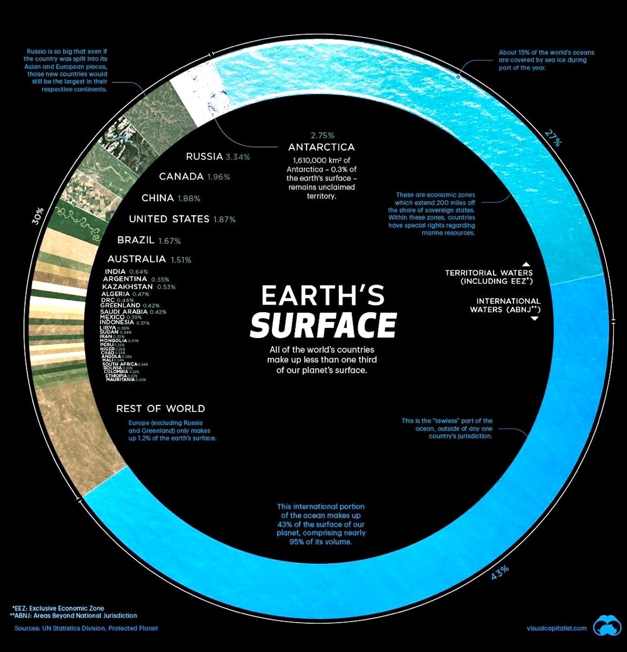 International waters make up 43% of our planet's surface area and represent 95% of its existing accessible resource endowments by volume. Even the largest five countries on the planet combined make up less than 10% of earth's surface area, which is 73% covered by the world's oceans. In a world of scarcity and competition over limited landlocked resources, Blue Ocean Resources represent a vital an timely opportunity for responsible future development.